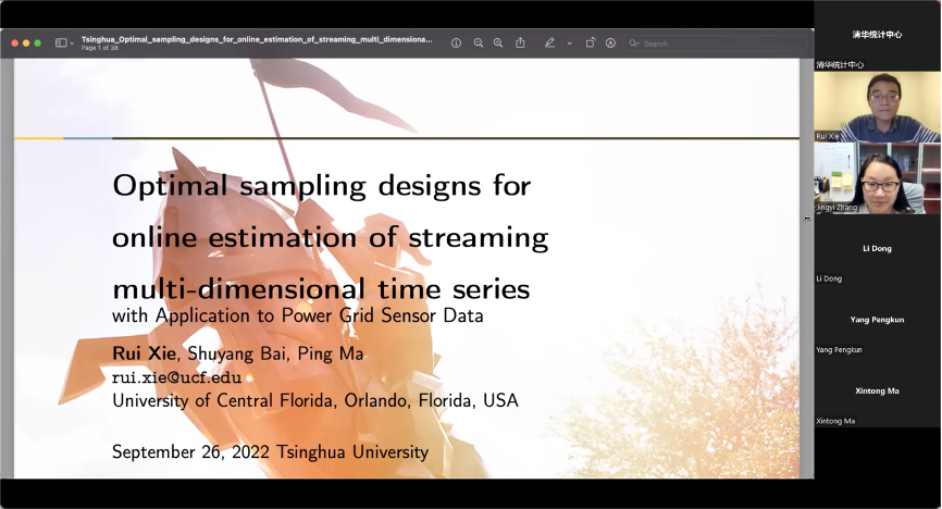 2022年9月26日,中佛罗里达大学谢睿助理教授通过线上平台与我中心教员交流,并进行线上学术报告,报告的题目是Optimal Sampling Designs for Online Estimation of Streaming Multi-dimensional Time Series