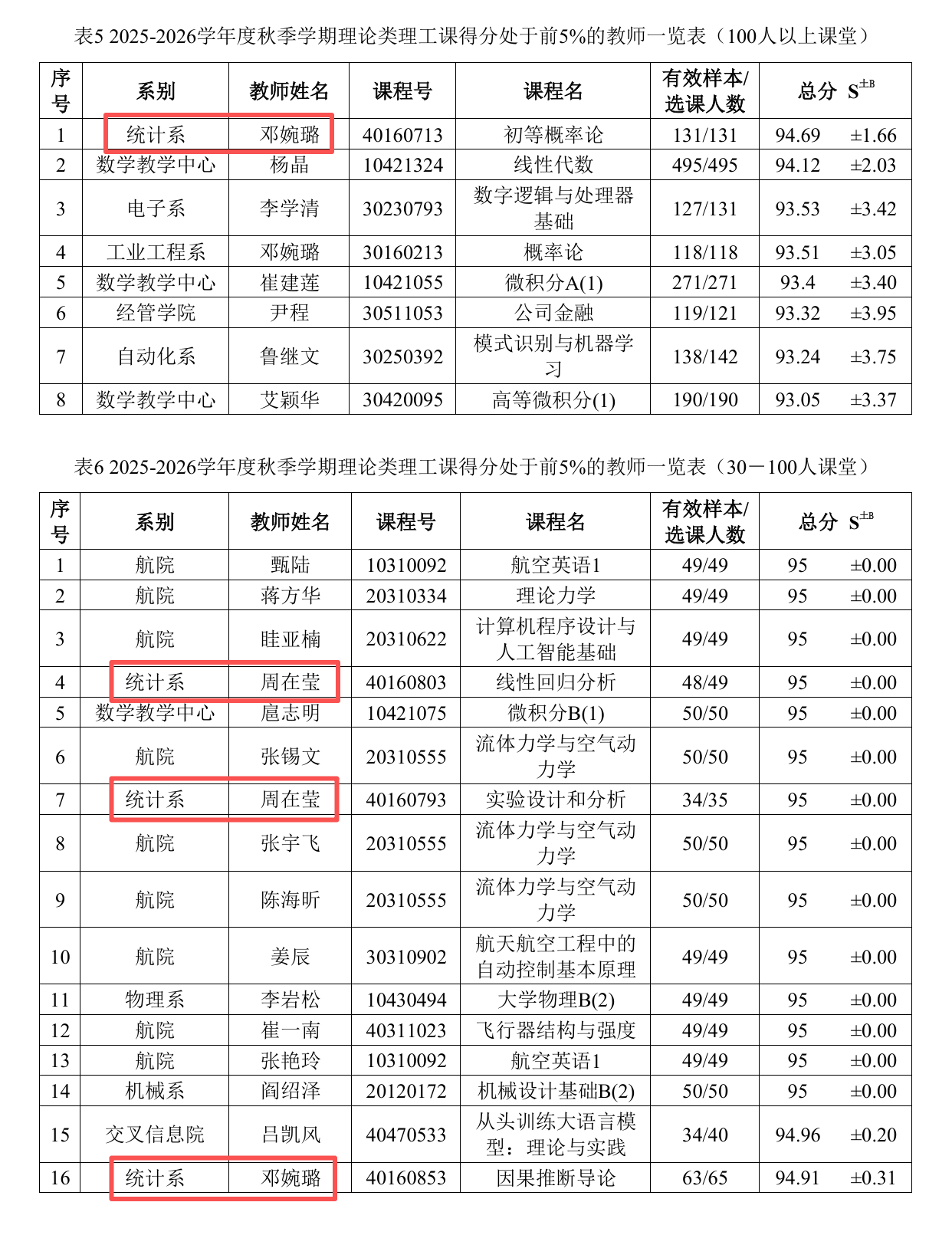 ●周在莹老师凭借《线性回归分析》、《实验设计和分析》入选“理论类理工课得分处于前5%的教师(30-100人课堂)” 榜单,课程均入选“全校课程得分前5%”。