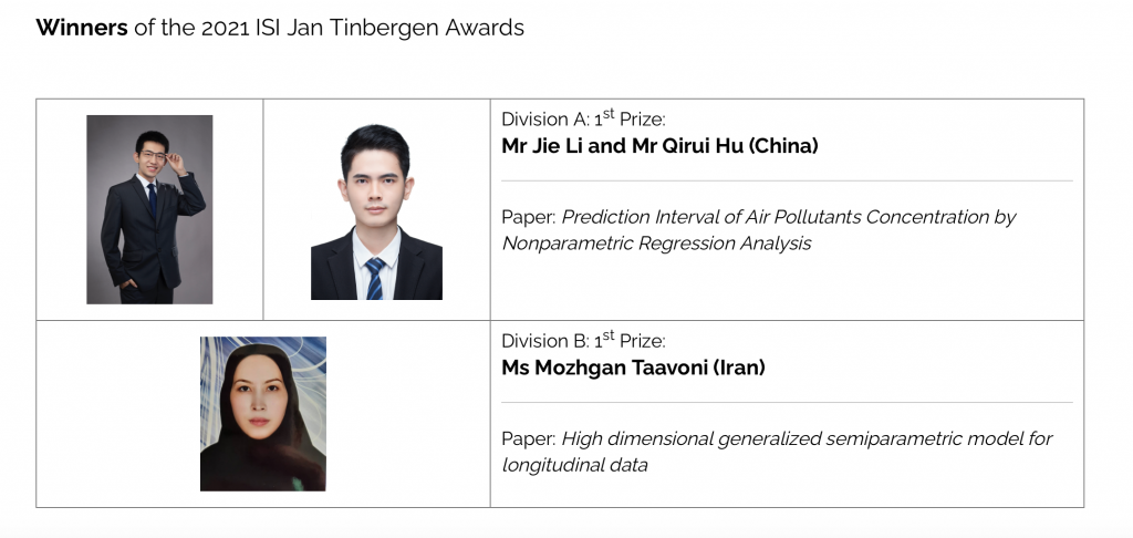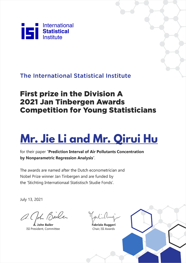 会2021年度简·丁伯根奖一等奖(2021 ISI Jan Tinbergen Award Division A First Prize)。