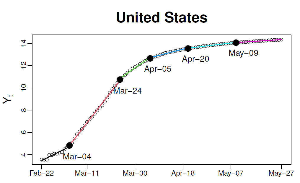 系访问期间,与其在UIUC的合作导师邵晓峰教授以及圣母大学的赵子锋助理教授合作完成的。新冠病毒(COVID-19)的累计确诊人数或累计死亡人数通常在病毒爆发初期快速增长,而后因为政府的各种干预政策增长率逐渐平缓直至为零。因此,在一段较短的时间内,可以假设累计确诊人数(死亡人数)的增长率是平稳不变的。利用此假设,该论文用分段线性趋势的半参数模型对全球30个国家感染新冠病毒的累计确诊人数和累计死亡人数进行建模。分段线性趋势模型首先使用自正则化(self-normalization)的方法将累计确诊人数(死亡人数)的对数曲线进行断点检测,依据这些增长率发生变化的断点再将曲线分割为多条平稳的线段,从而在每一条线段内,累计确诊人数(死亡人数)的增长率保持不变。下图为美国累计确诊人数的例子,该文将美国累计确诊人数的对数曲线近似地分割为六条线段,在每条线段内斜率(即增长率)保持不变。