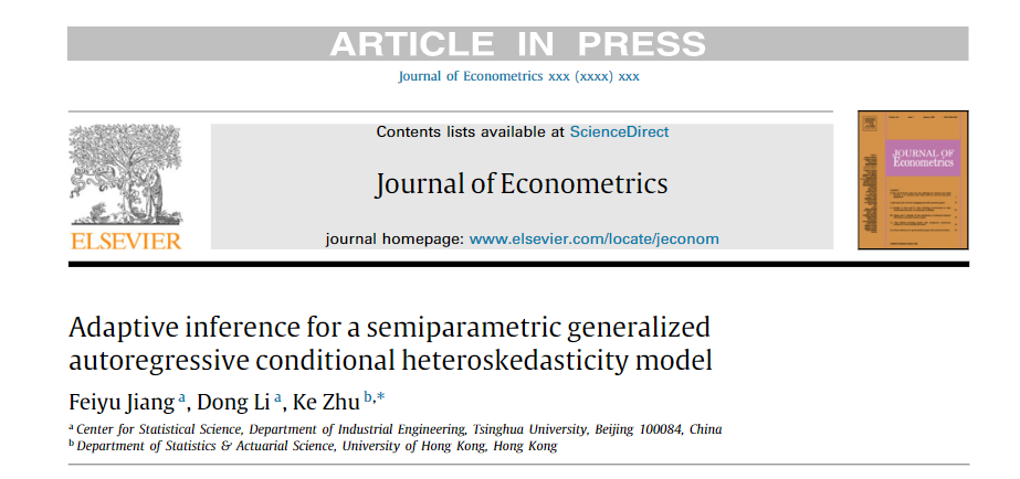 近日,中心五年级博士生蒋斐宇以第一作者的身份撰写的论文“Adaptive Inference for a Semiparametric Generalized Autoregressive Conditional Heteroskedasticity Model”被计量经济学顶尖期刊Journal of Econometrics接受并在线发表。此文是蒋斐宇同学发表的第3篇JOE论文。