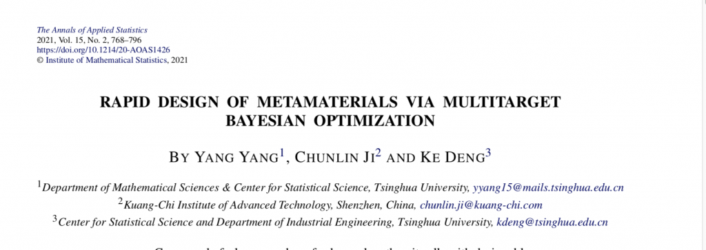 国际顶尖期刊The Annals of Applied Statistics (AOAS)发表题为“Rapid Design of Metamaterials via Multitarget Bayesian Optimization”的研究论文,提出了电磁超材料快速设计的新方法。曾在邓柯课题组攻读博士学位的杨洋博士(禁忌书屋
