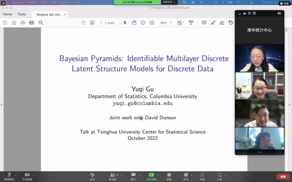2022年10月14日,哥伦比亚大学顾雨琦助理教授通过线上平台与我中心教员交流,并进行线上学术报告,报告的题目是Bayesian Pyramids: Identifiable Multilayer Discrete Latent Structure Models for Discrete Data。