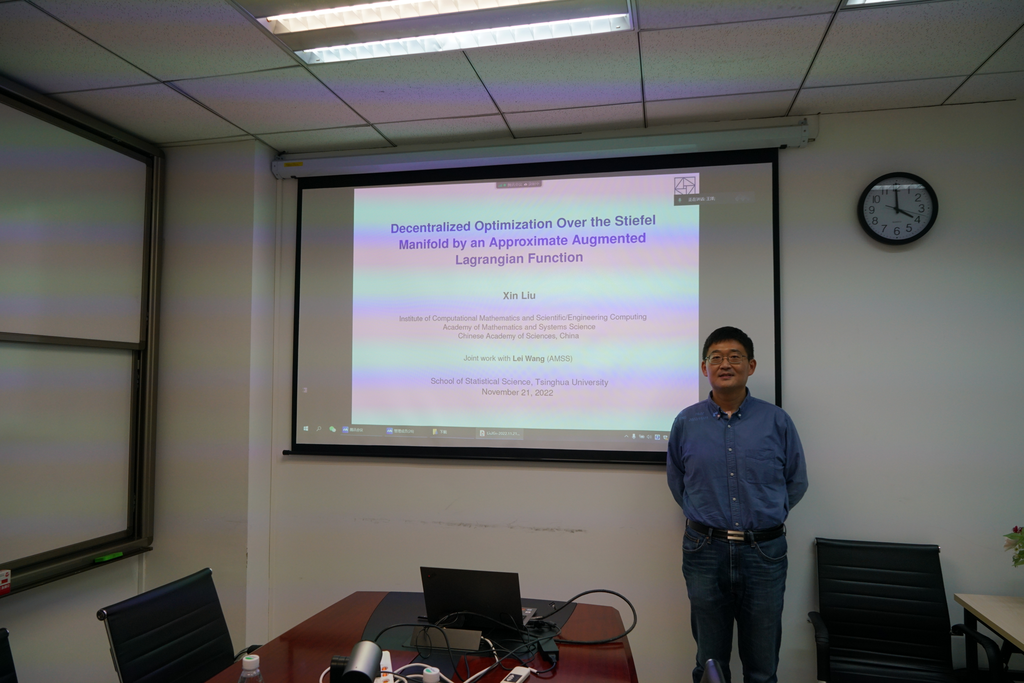 2022年11月21日,中国科学院刘歆研究员访问我中心,与中心教员座谈,并做特邀报告,报告的题目是Decentralized Optimization Over the Stiefel Manifold by an Approximate Augmented Lagrangian Function。